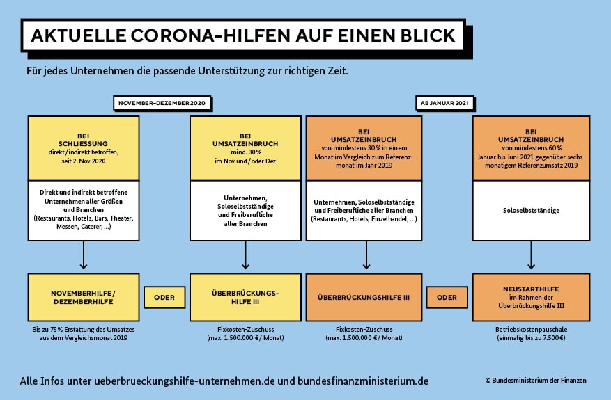 Auf dieser Seite möchten wir Ihnen einige Links mit Informationen zu den staatlichen Hilfen wegen des Corona-Virus zur Verfügung stellen. Wie Ihnen vermutlich bekannt ist, ist die Situation sehr dynamisch und die Programme ändern sich laufend. Für die Richtigkeit und Aktualität der Informationen können wir deshalb keine Haftung übernehmen. Hier eine aktuelle Übersicht: